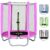 Die Beine des Trampolins sind aus drei W-förmigen Bogen gearbeitet, die großflächig an der Unterseite für Stabilität sorgen. Das Sportgerät sieht somit leicht, stabil und doch auch sportlich aus. Aktuell ist es in den Farben Schwarz, Pink, Grün oder Blau erhältlich. Verarbeitet sind alle Teile aus einen robusten Qualitätsmaterial, damit Kinder mit viel Sicherheit intensiv hüpfen können. Die Sprungfläche weist hierfür immerhin 97 cm Durchmesser auf. Das außen herum liegende Netz weist immerhin eine gespannte Gesamthöhe von 150 cm auf.